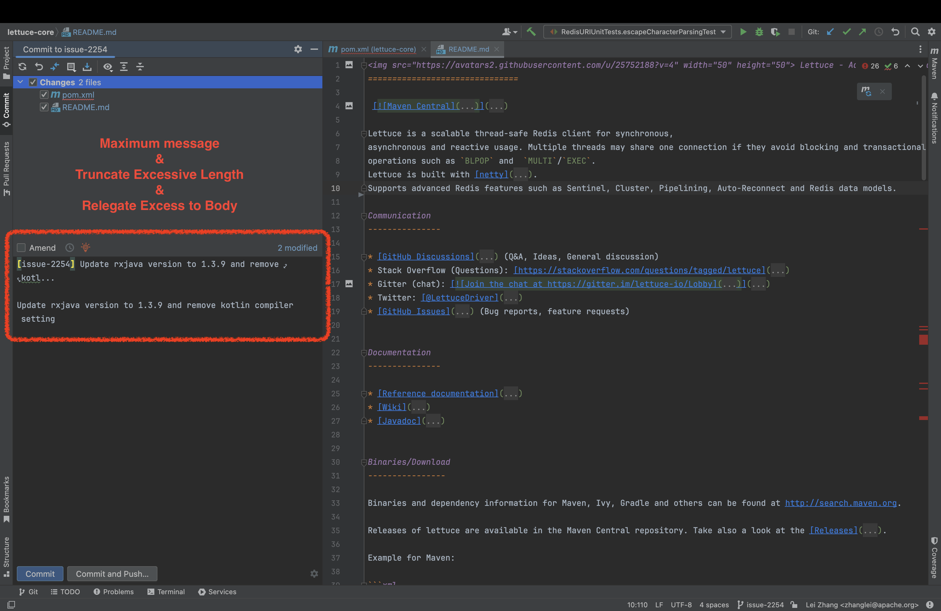 开启 Truncate excessive length 和 Relegate excess to body 选项后,如果生成的提交信息长度超过限制,会自动截断并将多余的信息放到 body 中。