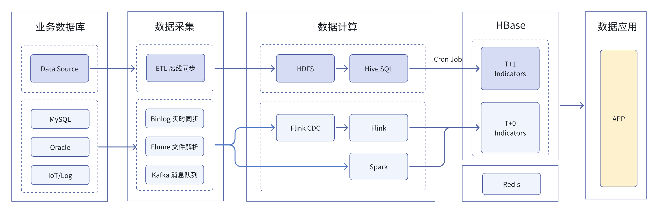 - T+0 实时数据:从业务数据库 MySQL 中实时同步 Binlog、利用 Flume 实时采集 IoT 工厂设备端日志,采集到实时数据会存储在 Kafka 消息队列中,通过 Flink 和 Spark 进行指标计算并将结果存储至 HBase 中。