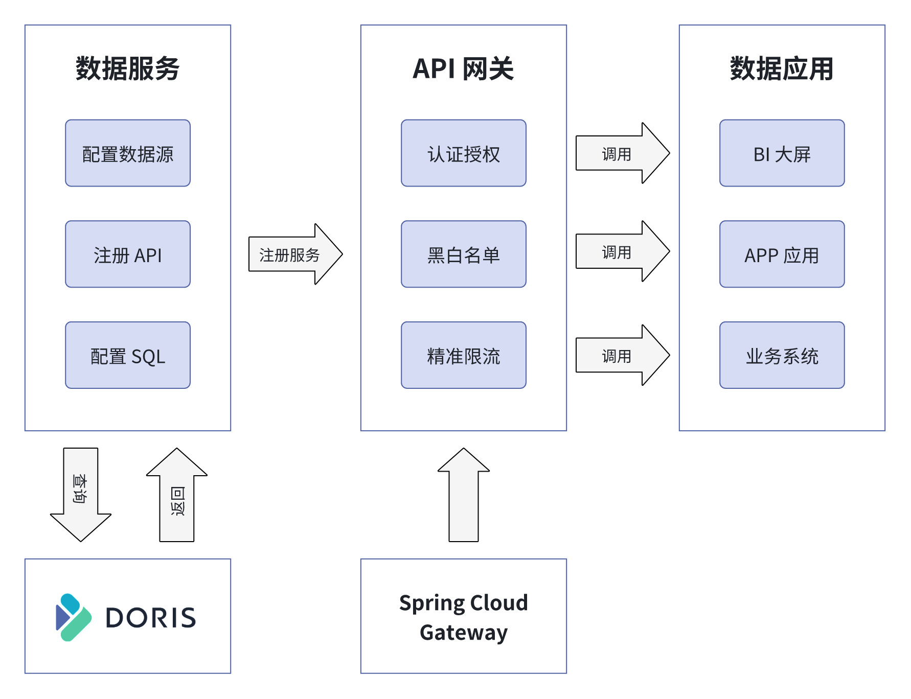 考虑到某些场景数据敏感、某些业务希望把数据中台计算好的数据嵌入到自己的业务系统中,因此,不便于在数据中台展示报表,因此我们基于 Apache Doris 构建了数据服务 API 平台。用户可以在页面上自主配置数据源、请求名称、SQL 配置等操作,当 SQL 配置完成后,就可以从 Doris 中读取数据,数据返回后通过 API 网关的认证授权、黑白名单、精准限流等操作,实现报表内容隐私性的保护。该平台由 Spring Cloud Gateway 提供统一的路由方式,调用数据主要服务 BI 大屏、APP 应用和其他业务系统。