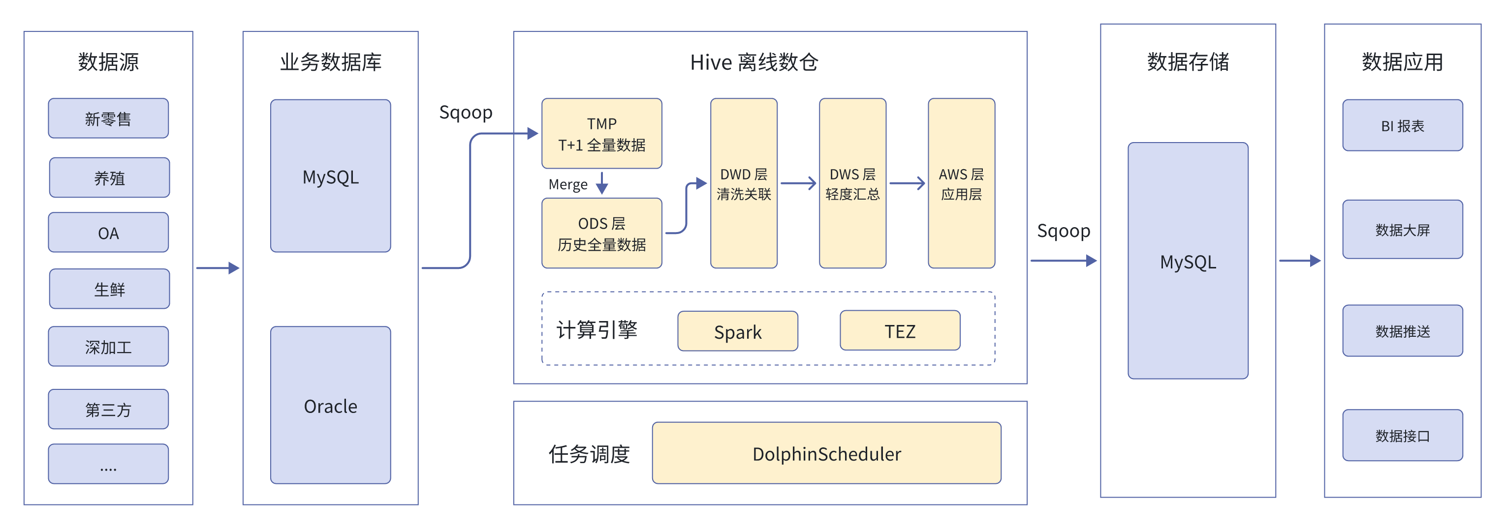 雨润集团的业务数据可细分为新零售(包括传统采购、销售、库存)、养殖数据、OA 数据(审批流程数据)、生鲜(采购的猪牛羊以及加工数据)、第三方数据(价格比对)等数据维度,均被存储在业务数据库 MySQL 和 Oracle 中,通过 Sqoop 将以上数据导入到 Hive 离线数仓中进行处理,为用户提供数据服务。具体来说: