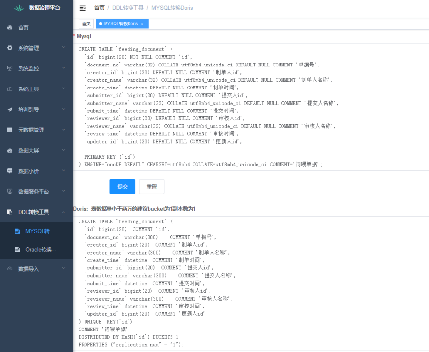 在实际应用过程中,我们发现从 MySQL 或者 Oracle 中同步数据表到 Doris 时,可能存在格式不统一的问题。我们可以通过自研的数据治理平台来实现数据类型的转换,以减少数据导入 Doris 时的建表时间,具体功能包括: