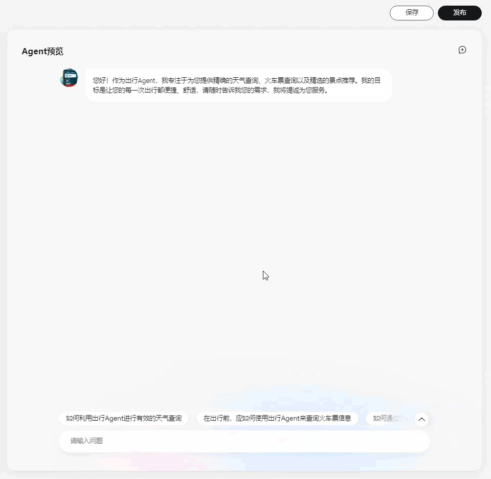 创建完成后,点击“开始体验”进行测试,即可让它根据你的需求反馈关于天气、交通、住宿等信息,一站式帮助你完成出行的规划。