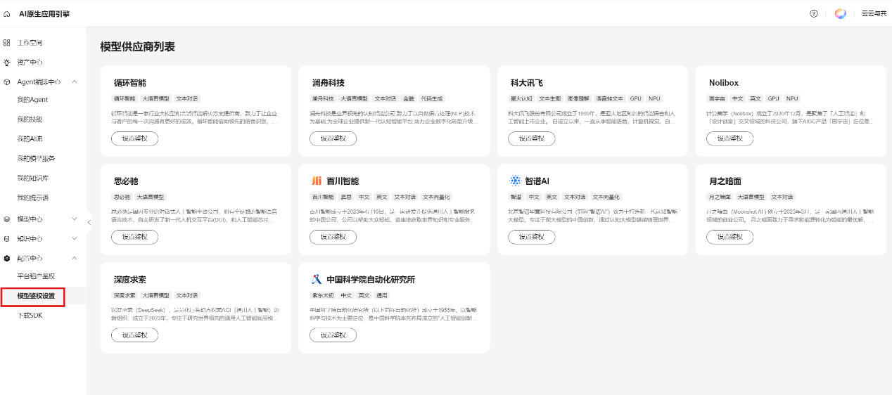 Tips:在创建agent之前,需要到“配置中心”里进行模型鉴权设置,这样在体验的时候,才能调用相关大模型。