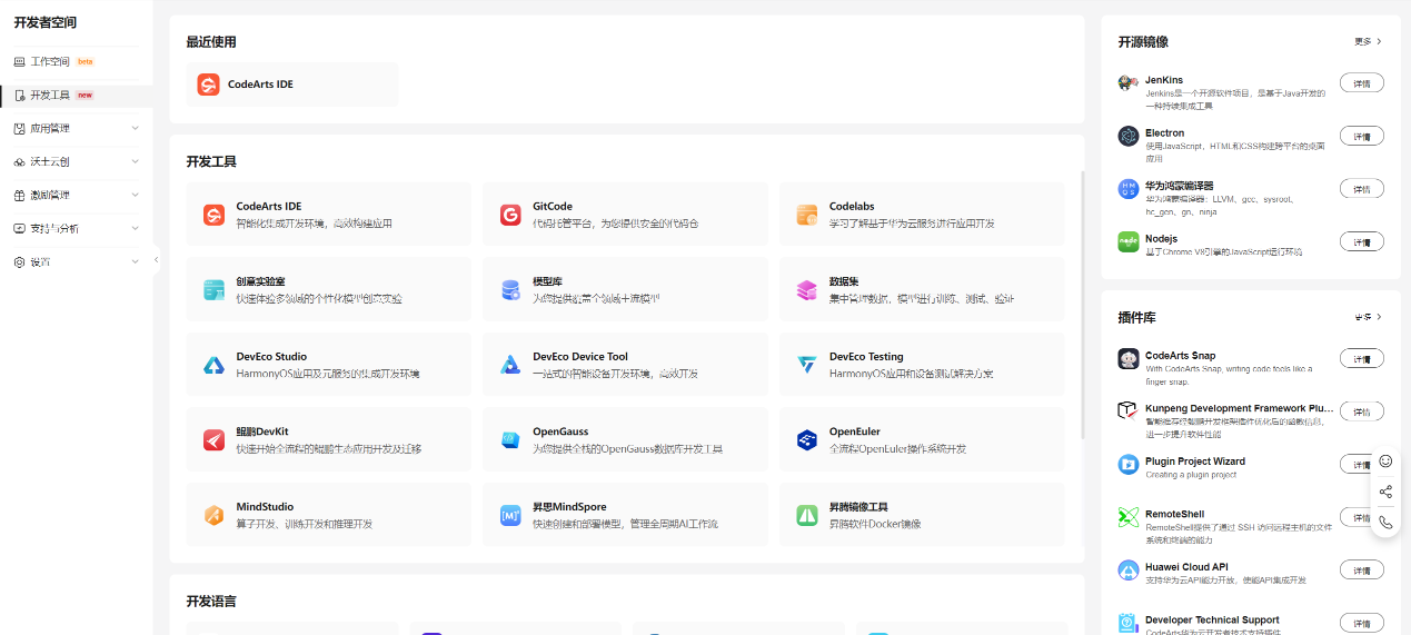 同时华为开发者空间聚合了以华为云CodeArts IDE为核心的多元生态开发工具及资源,包括鲲鹏、昇腾、鸿蒙生态的开发工具资源入口,丰富的开源镜像、热门开发插件等,覆盖代码托管,开发编译、测试、部署、运维等应用构建全旅程,高效支撑开发者进行各类场景的应用开发。