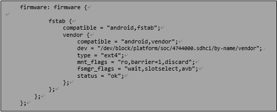 firmware:firmware中“:”之前的内容为引用申明。只有申明后才可以在其他地方引用。Firmware下的fstab 节点没有引用声明,在其他位置就不可以引用。如果要修改fstab节点里的属性,引用firmware节点然后修改其中属性,案例如下: