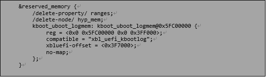 如上案例中,引用reserved-memory节点,并删除了ranges属性,删除了hyp_mem节点,新增了kboot_uboot_logmem节点;