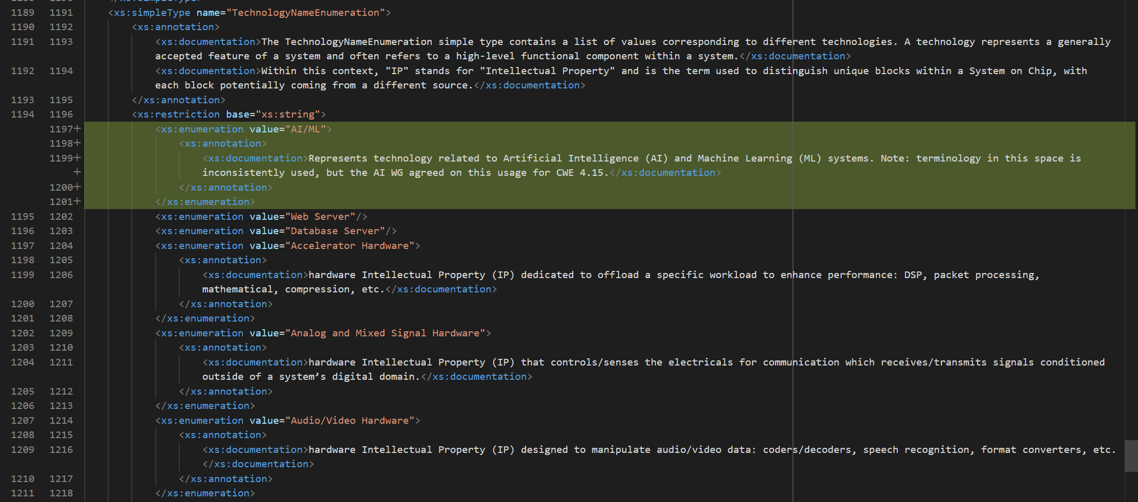 - 在节点定义的 schema 中, 将 AI/ML 作为适用平台添加到以下 CWE 中。