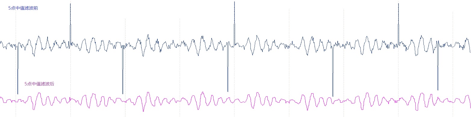 输入滑动窗口长度,取值范围是3-501点。窗口逐点滑动,计算每次滑动后窗口内信号数据的中值,用于取代滑动窗口中间点的信号值。当窗口长度m为奇数,中点位置为p=(m-1)/2,当滑动窗口长度m为偶数时中间点位置为p=m/2,窗口中的数据序列为x(0),x(1),…,x(p),…,x(m-2),x(m-1)。中值的计算方法是:将窗口内数据由小到大排序,如果窗口长度m为奇数,则取排序后中间位置的值,如果窗口长度为偶数,则取排序后中间两点的平均值。