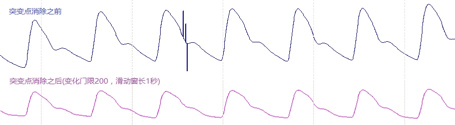 输入突变门限和滑动窗口长度(s),将信号差分绝对值大于门限的的差分值设置成零。然后,去掉差分序列的基线,基线是差分序列的滑动平均,滑动窗口长度为输入长度。将所得到的序列反差分后得到输出序列。