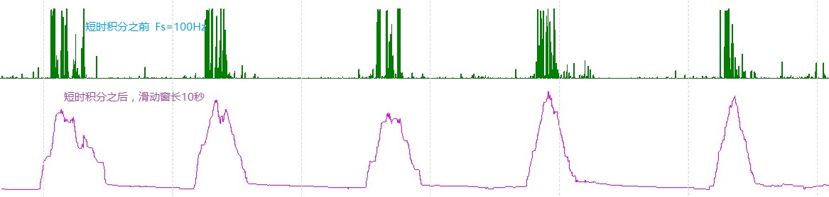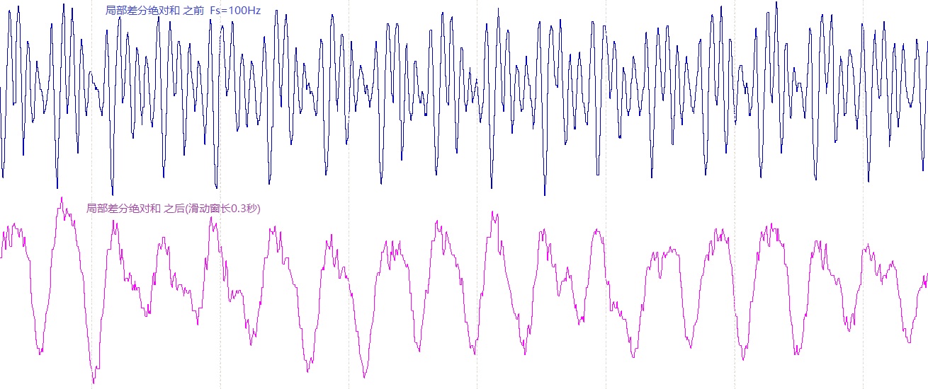 短时积分可以产生向上的凸包(能量集中区)。输入滑动窗口长度(s) ,计算滑动窗口内信号差分绝对值的平均。对于相邻两点相等的点,则差分值替换成信号与窗口内的平均值之差,以此来适应上下饱和的直线情况,因而不适合那种非饱和情况下出现频繁相邻点相等的情况。