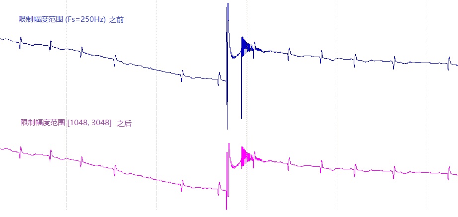 对于第ch通道信号x(i),i=0,1, ..., n-1,输入信号幅度范围[a, b],其中a是AD数字的最小值,b是AD数字的最大值,如果x(i)<a或者x(i)>b,超出了输入的幅度范围,则用信号中前一个在[a,b]范围内的有效值来替代此处的x(i)。如果选择要消除无效值(即信号中的空洞处之值),则也用这个值替代无效值。这样就把信号值范围限制在[a,b]之间。