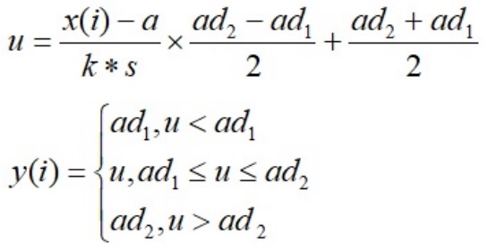 设滑动窗口内的平均值为a,标准差为s,门限为k,输出幅度范围为[ad1, ad2],那么,