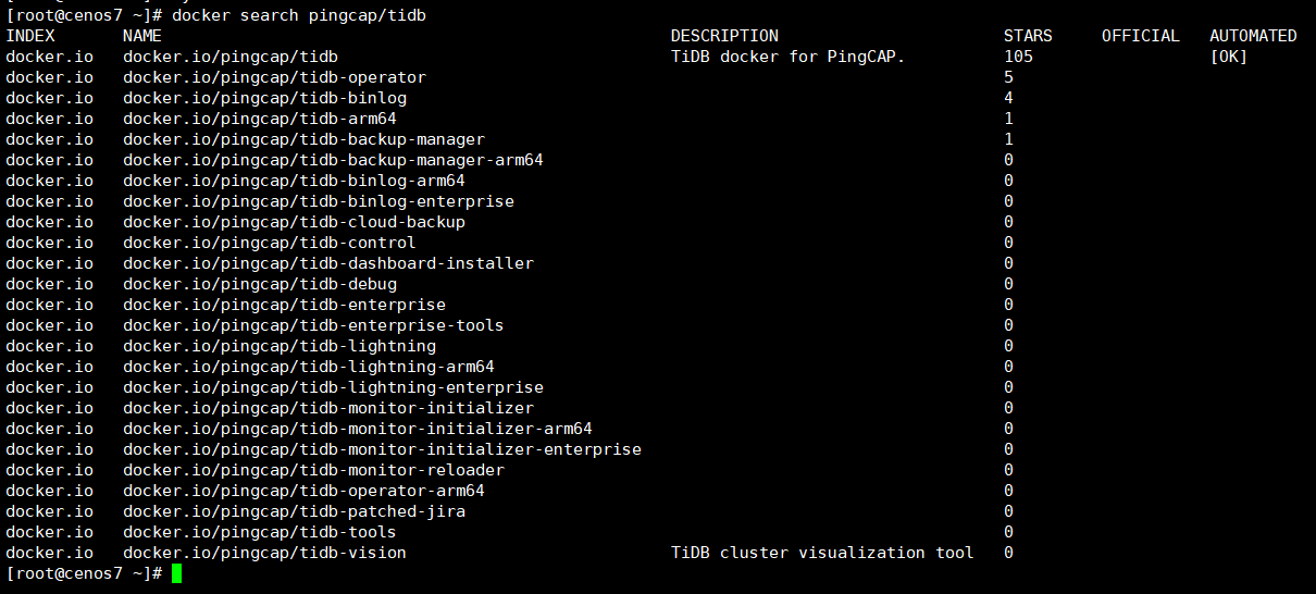 docker search pingcap/tidb # 搜索镜像,如果搜索不到需要设置docker仓库源