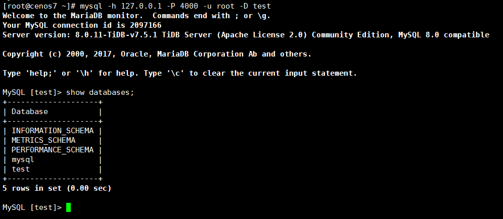 mysql -h 127.0.0.1 -P 4000 -u root -D test #使用mysql客户端命令尝试登录tidb