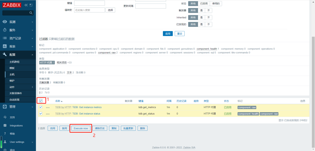 添加完成后,可在主机管理界面,对http代理类型的监控项触发立即执行,使其快速获取数据和创建自动发现的监控项。
