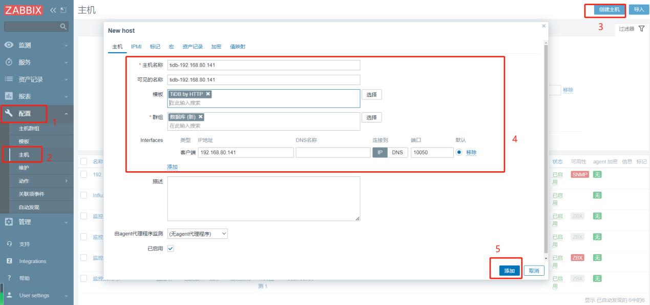 点击配置->主机->创建主机,填写主机名称,选择刚刚导入的TiDB监控模板,设置一个群组。