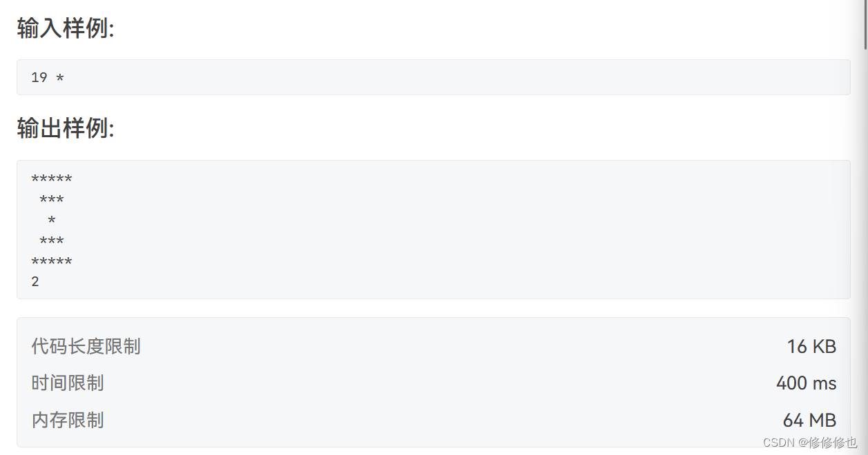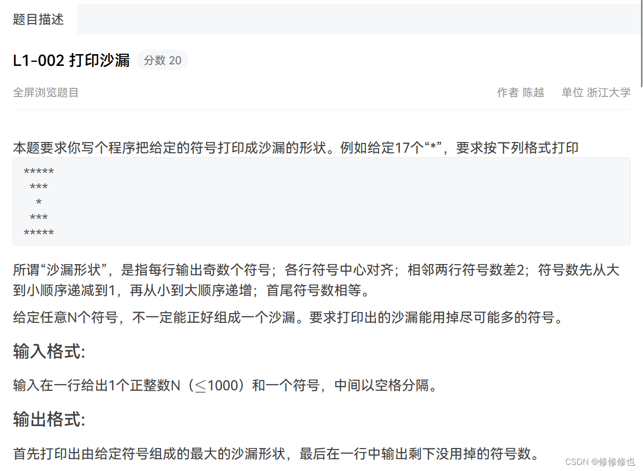 所谓“沙漏形状”,是指每行输出奇数个符号;各行符号中心对齐;相邻两行符号数差2;符号数先从大到小顺序递减到1,再从小到大顺序递增;首尾符号数相等。