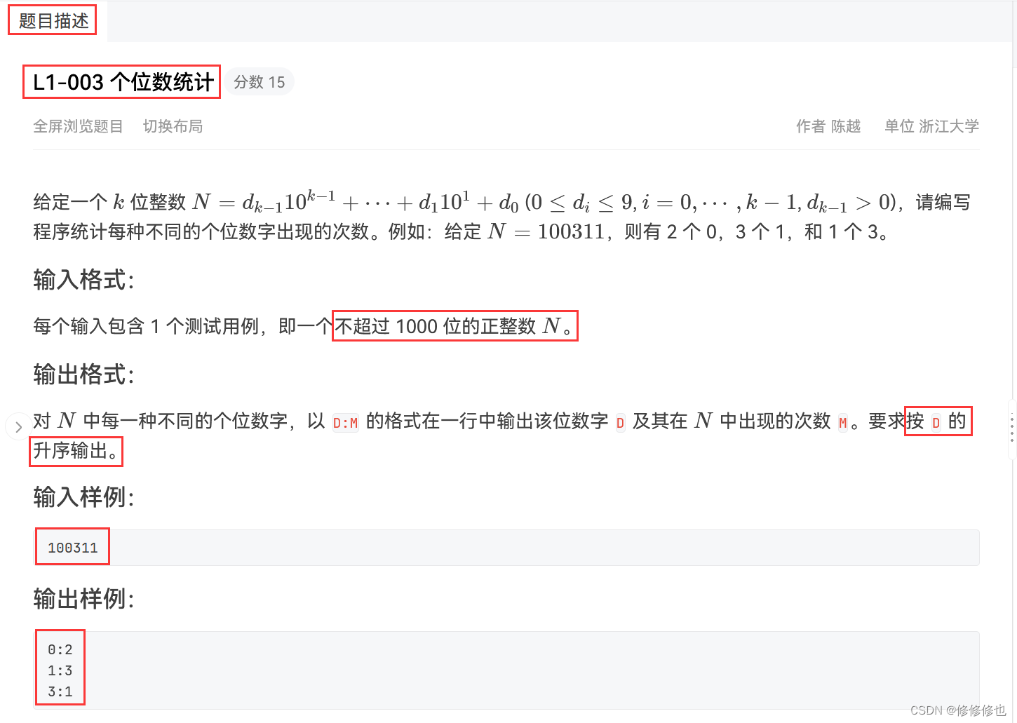 给定一个 k 位整数 N=dk−110k−1+⋯+d1101+d0 (0≤di≤9, i=0,⋯,k−1, dk−1>0),请编写程序统计每种不同的个位数字出现的次数。例如:给定 N=100311,则有 2 个 0,3 个 1,和 1 个 3。