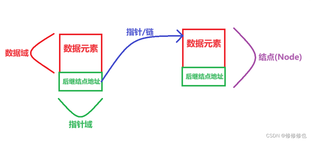 单链表结点(Node)需要包含两个要素:数据域data,指针域next.