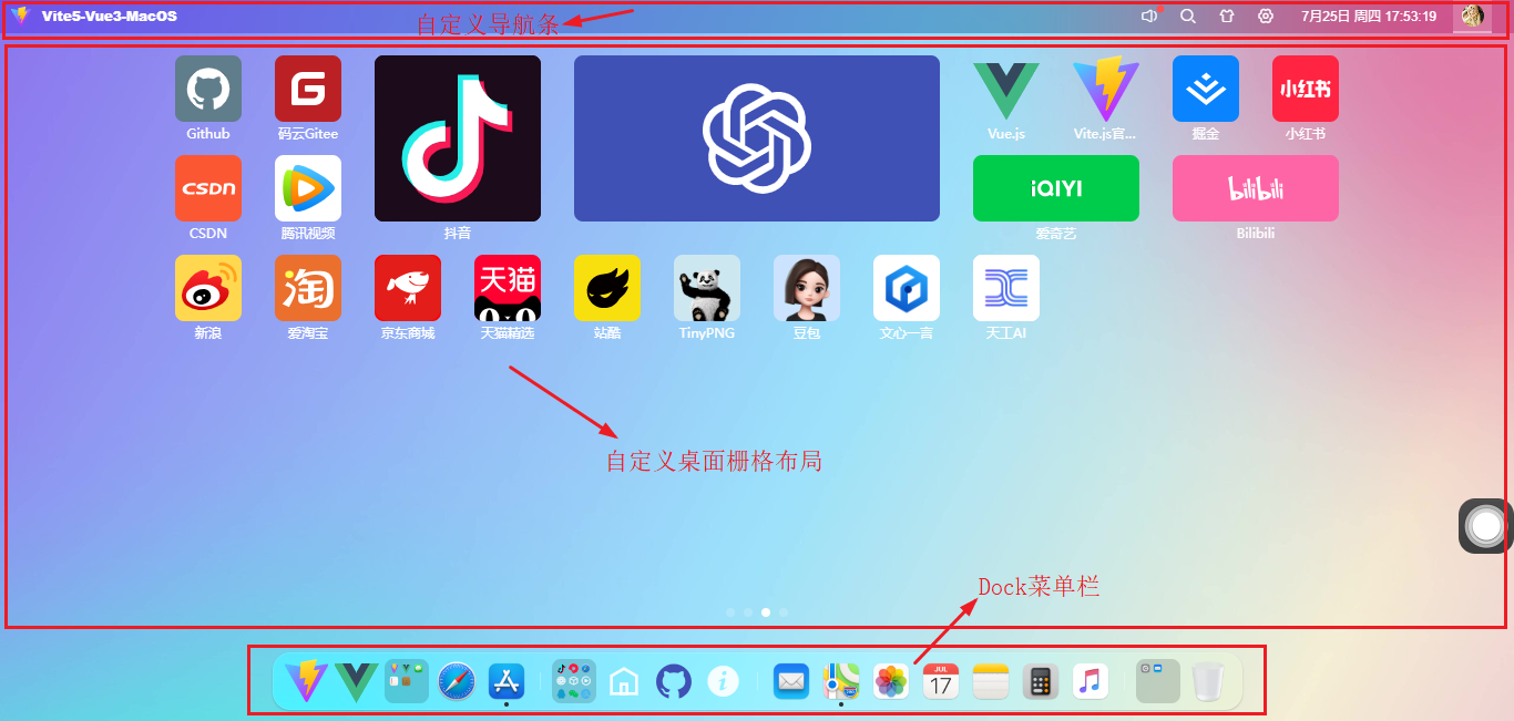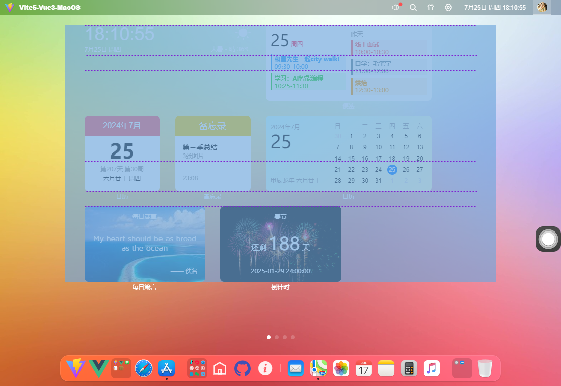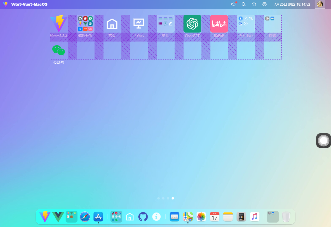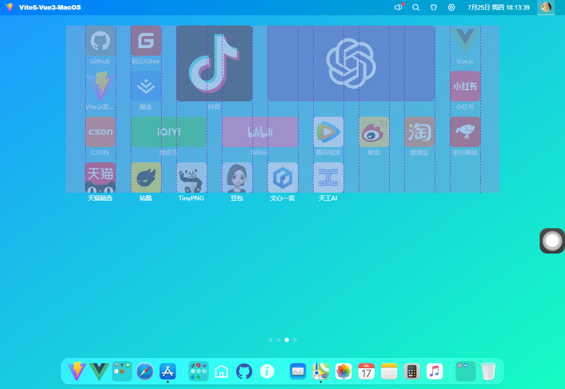 【摘要】 基于最新前端技术vite5.x+vue3+pinia2+arco.design+sortablejs+echarts构建网页版osx后台管理系统Vue3MacOS。支持自定义桌面栅格布局引擎、可拖拽桌面图标、多屏分页管理、自定义桌面壁纸主题、毛玻璃虚化背景等功能。