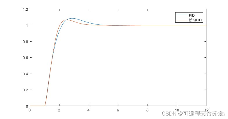 将PID控制器的控制响应曲线和模糊PID控制响应曲线放一起对比,结果如下:
