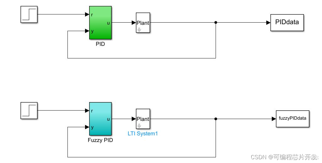 PID控制器和模糊PID控制器通过Simulink建模实现,在matlab中编程实现模糊控制规则,PID控制器参数计算。运行simulink模型之后,将2个控制器的控制响应曲线进行对比得到仿真结果。