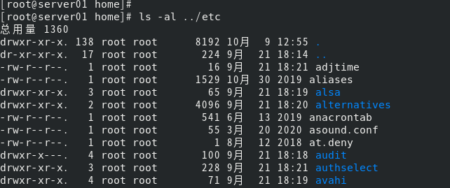 (6) 在第(5)题的基础上,使用相对路径,显示/etc目录的内容,要求用长格式显示,隐藏文件也要显示。 [root@server01 home]# ls -al ../etc