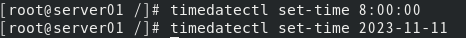 (9) 设置系统当前日期和时间为2023年11月11日早上八点。 [root@server01 /]# timedatectl set-time 8:00:00 [root@server01 /]# timedatectl set-time 2023-11-11 [root@server01 /]# timedatectl set-time "2023-11-11 8:00:00"