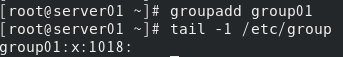 (1) 创建用户组group01,观察组配置文件/etc/group的变化,写出结论。 [root@server01 ~]# groupadd group01 [root@server01 ~]# tail -1 /etc/group group01:x:1018: