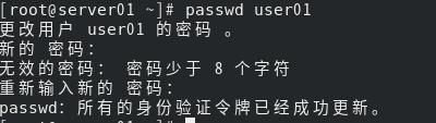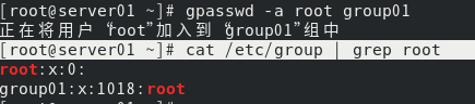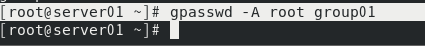 结论:属于root和group01用户组 (15) 设置root用户为用户组group01的管理员。 [root@server01 ~]# gpasswd -A root group01