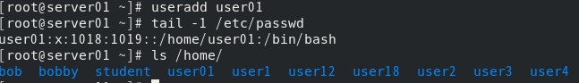 结论:/etc/group文件增加了一个组的记录,说明增加了一个组 (2) 使用默认参数创建用户user01,观察用户配置文件/etc/passwd的变化,观察/home目录下是否有新创建的子目录,写出结论。 [root@server01 ~]# useradd user01 [root@server01 ~]# tail -1 /etc/passwd user01:x:1018:1019::/home/user01:/bin/bash