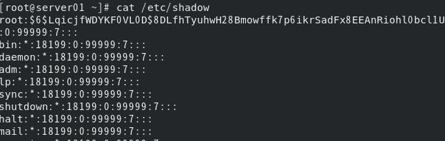 结论:新增一名user01用户 (3) 设置用户user01的密码为123456。按下Alt+CTRL+F3后,切换到虚拟控制台界面,用user01用户能够成功登录。使用user01和root用户分别查看/etc/shadow文件,写出结论。 [root@server01 ~]# passwd user01