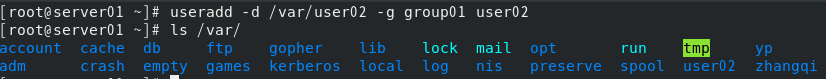 结论:查看到目录一致 (5) 按下Alt+CTRL+F1后,回到登录界面,使用root用户登录,创建用户user02,指定用户主目录为/var/user02,指定主组为group01,并查看创建结果,注意观察:/var/user02目录会不会在这次操作中自动创建,写出观察结论。 [root@server01 ~]# useradd -d /var/user02 -g group01 user02