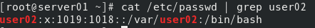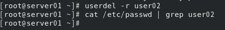 (18) 在虚拟控制台界面F1主控台,root用户登录,删除user02用户及其主目录以及该用户的相关文档,观察用户配置文件/etc/passwd的变化,写出结论。 [root@server01 ~]# userdel -r user02