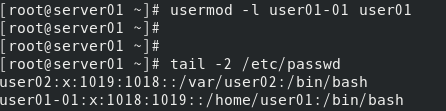 (8) 使用命令usermod将用户user01的用户名修改为user01-01,并查看修改结果。 [root@server01 ~]# usermod -l user01-01 user01