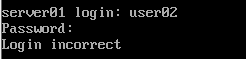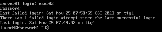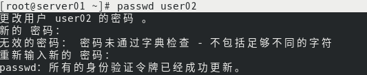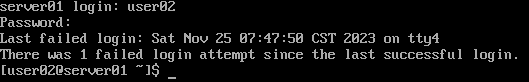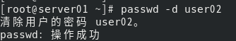 结论:使用passwd命令解锁用户user02的密码,去掉了/etc/shadow文件中密码前的两个感叹号,也可以正常登录user02账号了 (12) 在虚拟控制台界面F1主控台,root用户使用passwd命令删除用户user02的密码,在虚拟控制台界面F4观察用户user02是否能不使用密码登录,写出结论。 [root@server01 ~]# passwd -d user02