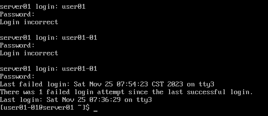 (9) 在虚拟控制台界面F3,分别使用user01-01和user01登录,观察操作结果,写出结论。