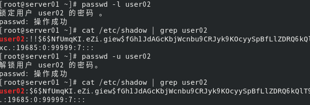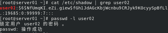 结论:锁定user02的密码后,user02使用正常的密码不能登陆 (11) 在虚拟控制台界面F1主控台,root用户使用passwd命令解锁用户user02的密码,查看/etc/shadow文件在密码解锁后的变化,在虚拟控制台界面F4观察用户user02是否能登录,写出结论。 [root@server01 ~]# passwd -u user02