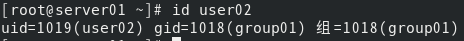 (16) 使用id命令查看用户user02信息,写出结论。 [root@server01 ~]# id user02 uid=1019(user02) gid=1018(group01) 组=1018(group01)