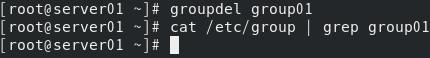 结论: 用户配置文件/etc/passwd没有user02用户的相关信息,全部删除 (19)删除用户组group01,观察组配置文件/etc/group的变化,写出结论。 [root@server01 ~]# groupdel group01 [root@server01 ~]# cat /etc/group | grep group01