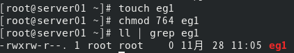 (1) 在/root下创建文件eg1,修改文件权限为所有者可读可写可执行,用户组可读可写不可执行,其他用户可读不可写不可执行,用绝对权限方法,并查看结果。 [root@server01 ~]# touch eg1 [root@server01 ~]# chmod 764 eg1 [root@server01 ~]# ll | grep eg1