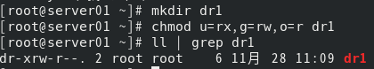 (2) 在/root下创建目录dr1,修改目录权限为所有者可读不可写可执行,用户组可读可写不可执行,其他用户可读不可写不可执行,用相对权限方法,并查看结果。 [root@server01 ~]# mkdir dr1 [root@server01 ~]# chmod u=rx,g=rw,o=r dr1 [root@server01 ~]# ll | grep dr1