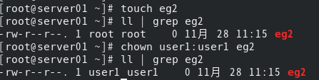 (3) 用默认参数方式创建用户user1,查看结果;在/root下创建文件eg2,查看文件属性;修改文件的所有者为user1,用户组为user1,查看结果。 [root@server01 ~]# useradd user1 [root@server01 ~]# cat /etc/passwd | grep user1 [root@server01 ~]# touch eg2 [root@server01 ~]# ll | grep eg2 [root@server01 ~]# chown user1:user1 eg2 [root@server01 ~]# ll | grep eg2