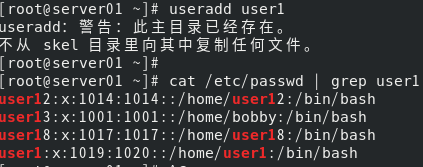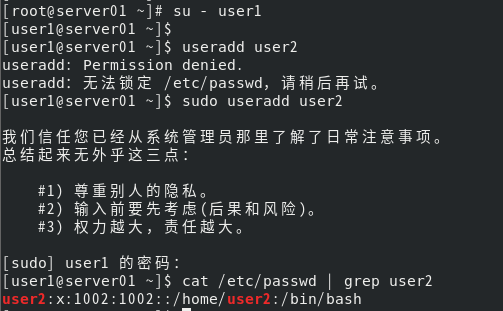 (6) 把user1用户设为sudoer,使得user1用户具有管理员权限;使用user1用户登录,操作用默认参数方式创建用户user2,观察是否成功,写出结论。 [root@server01 ~]# visudo [root@server01 ~]# su - user1 [user1@server01 ~]$ sudo useradd user2 [user1@server01 ~]$ cat /etc/passwd | grep user2