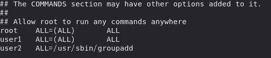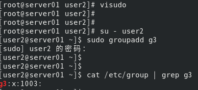结论:使用user1用户创建user2用户成功 (7) 用提升权限的办法,使得用户user2仅仅提升了具有执行添加用户组的命令权限;使用user2用户登录,操作用创建用户组g3,观察是否成功,写出结论。 [root@server01 user2]# visudo [root@server01 user2]# su - user2 [user2@server01 ~]$ sudo groupadd g3