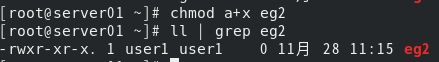 (5) 对/root下文件eg2,使用一条命令使得所有用户都具有执行权限,查看结果。 [root@server01 ~]# chmod a+x eg2 [root@server01 ~]# ll | grep eg2