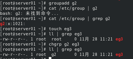 (4) 创建用户组g2,查看结果;在/root下创建文件eg3,查看文件属性;修改文件的用户组为g2,文件的所有者不变,查看结果。 [root@server01 ~]# groupadd g2 [root@server01 ~]# cat /etc/group | grep g2 [root@server01 ~]# touch eg3 [root@server01 ~]# ll | grep eg3 [root@server01 ~]# chgrp g2 eg3 [root@server01 ~]# ll | grep eg3