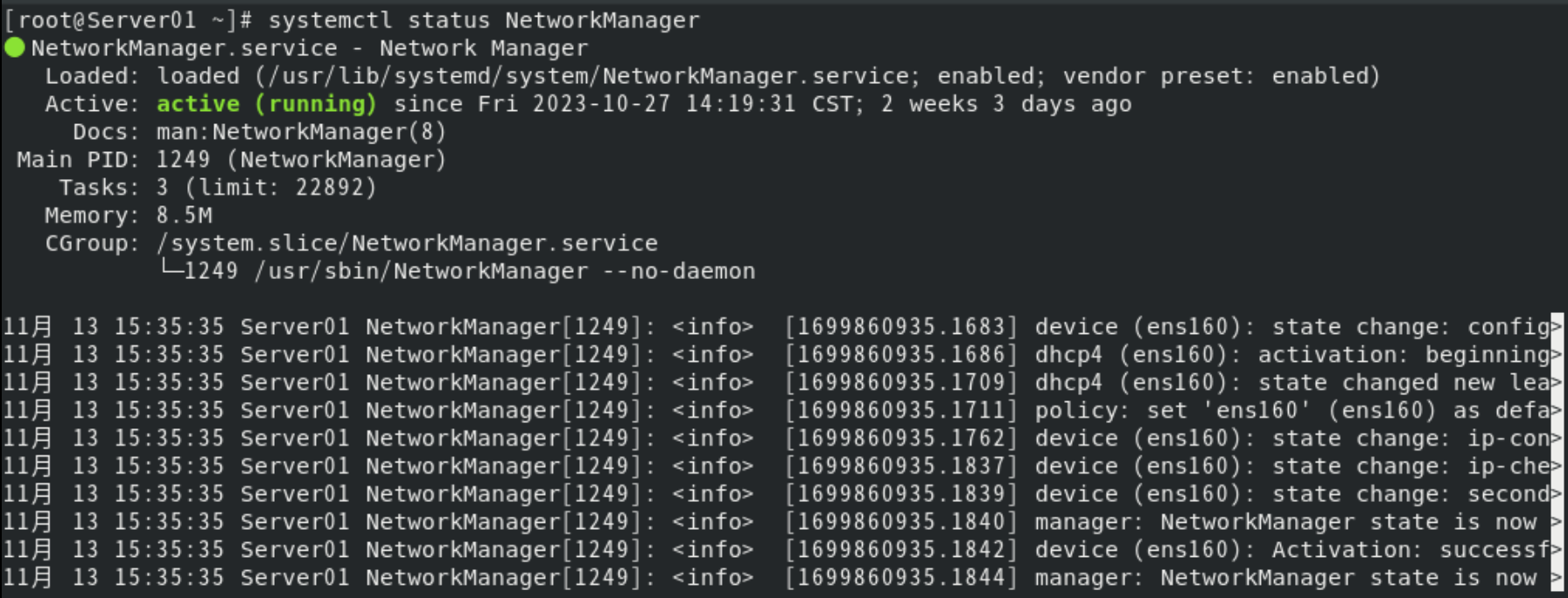 (1) 写出查看NetworkManager服务状态的命令。 [root@Server01 ~]# systemctl status NetworkManager