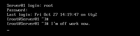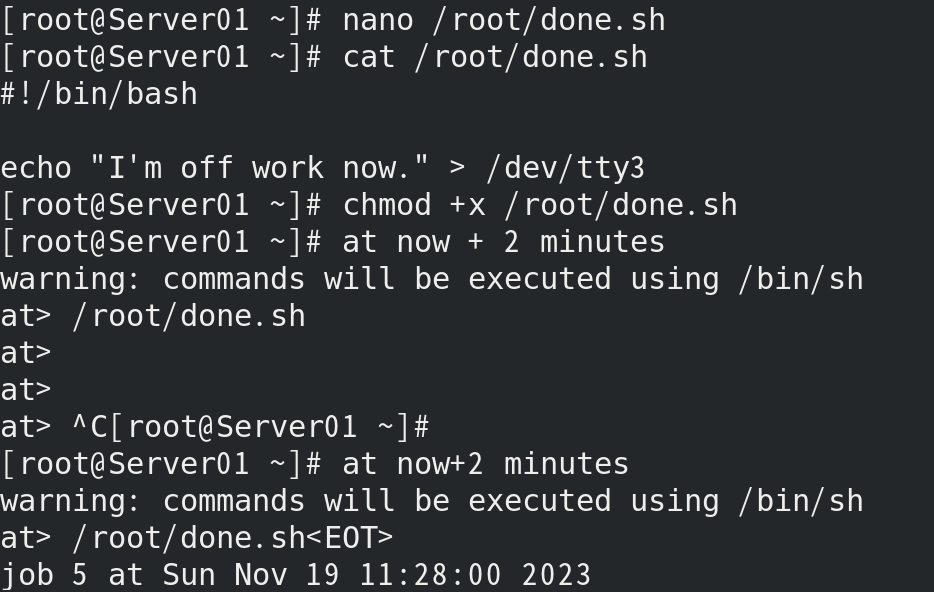 (3) 用at命令制定任务:系统2分钟后在tty3终端输出提醒: “I’m off work now. ”,以提醒用户下班。 [root@Server01 ~]# nano /root/done.sh [root@Server01 ~]# cat /root/done.sh [root@Server01 ~]# chmod +x /root/done.sh [root@Server01 ~]# at now + 2 minutes