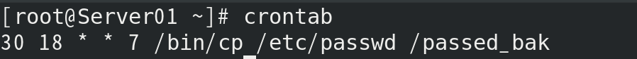 (4) 用crontab制定任务: 每周日下午六点半,复制/etc/passwd文件到根目录下passwd_bak中。 [root@Server01 ~]# crontab 30 18 * * 7 /bin/cp /etc/passwd /passed_bak